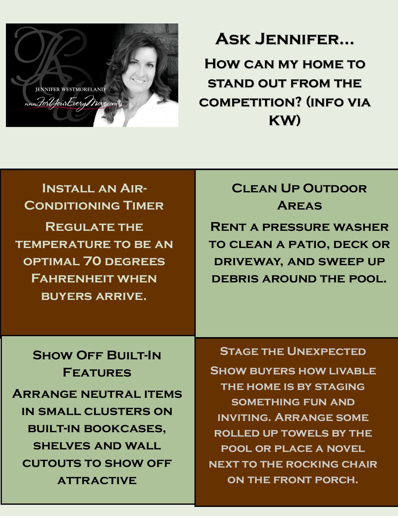 | 1. Install an Air-Conditioning Timer – Regulate the temperature to be an optimal 70 degrees Fahrenheit when buyers arrive. |